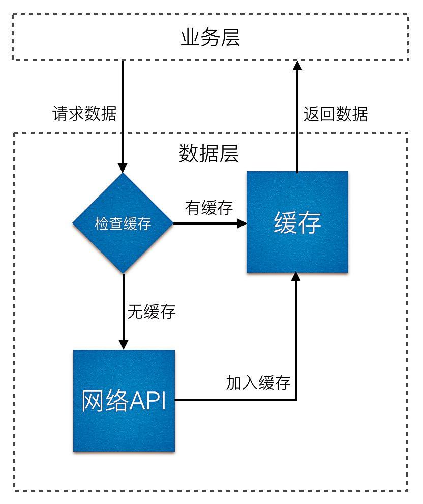 数据层是数据管理者,主要任务就是封装API,并将数据结果交付给上层,中间会再加个数据缓存。整个主流程如下图: